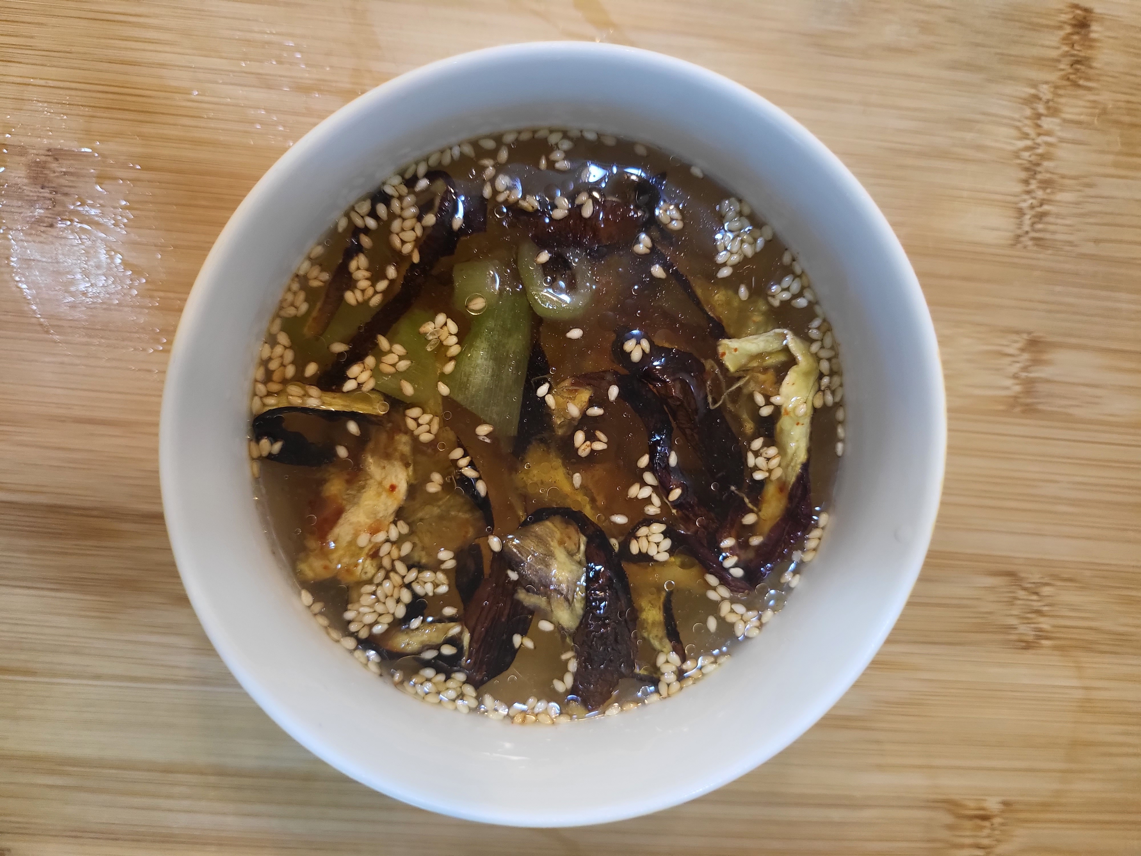 6. 국물에 가지와 대파, 통깨, 참기름을 넣고 잘 섞습니다.